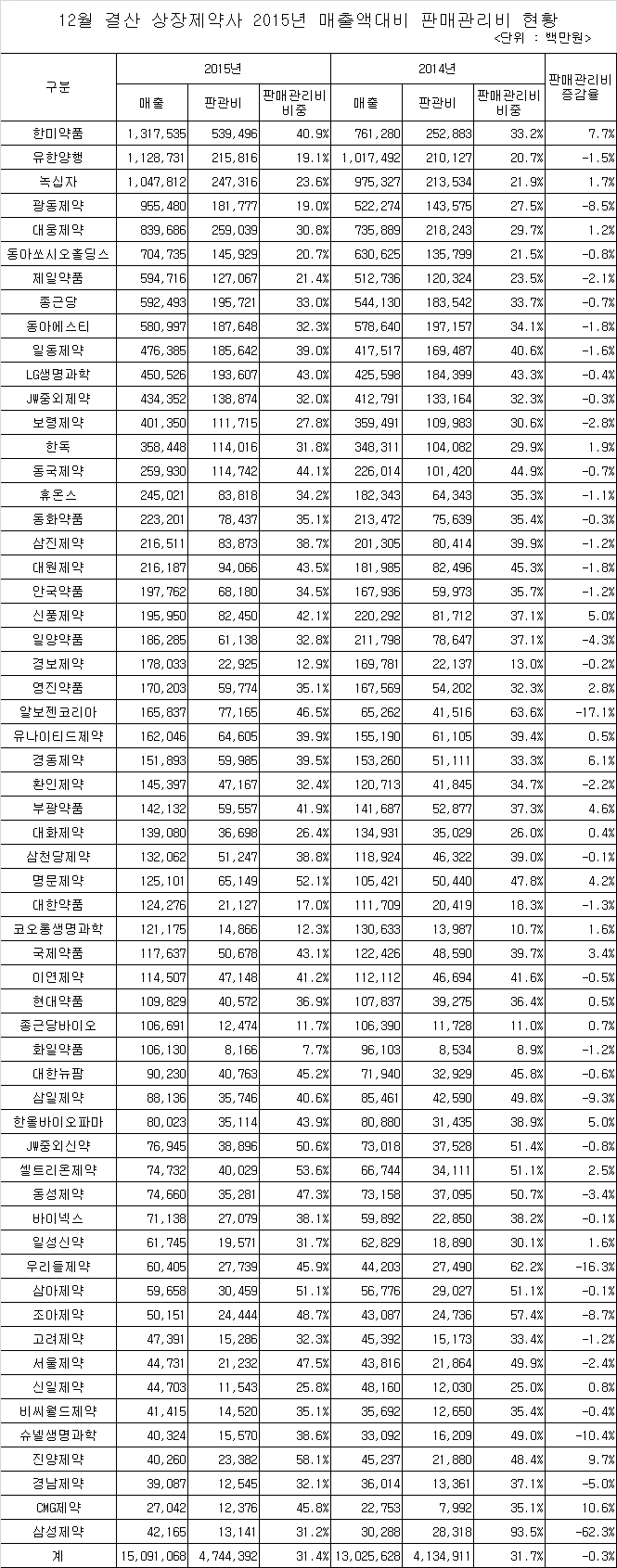 약업닷컴(www.yakup.com)이 12월 결산 코스피 및 코스닥 상장제약사들의 2015년 감사보고서를 분석헌 결과, 조사 대상 59개 기업의 매출액 대비 판매관리비 비중은 31.4%였다.