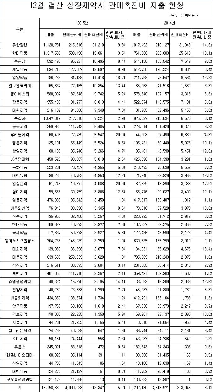 유한양행은 2014년에 비해 94억원, 한미약품 66억, 동아에스티 36억, 대화제약 20억, 셀트리온제약 15억, 우리들제약 11억, 경보제약 10억 등의 판매관리비 지출을 줄인 것으로 조사됐다.