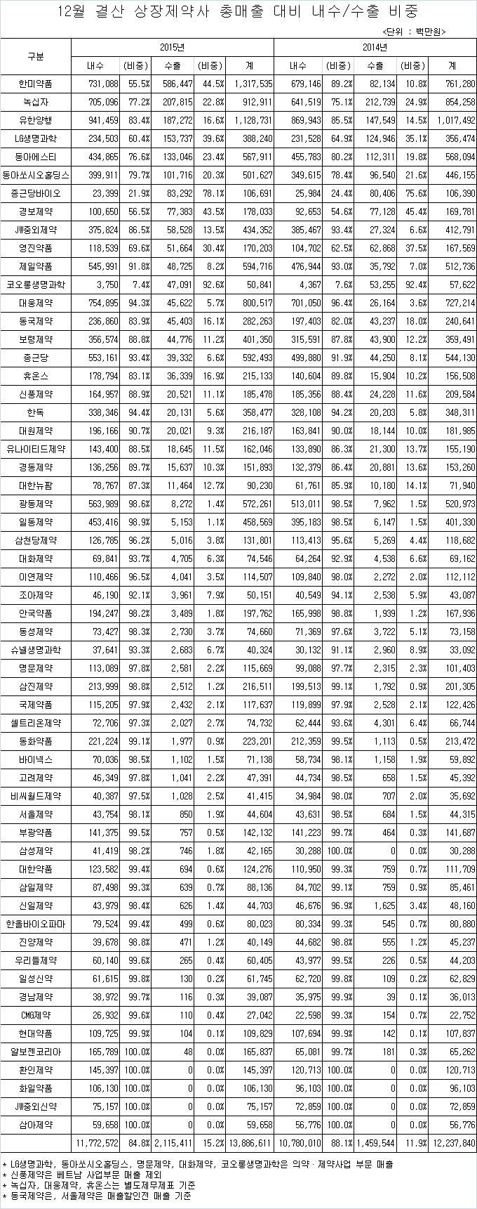 약업닷컴(www.yakup.com)이 12월 결산 코스피 및 코스닥 상장제약사들의 2016년 사업보고서를 분석한 결과, 총매출에서 내수비중은 84.8%, 수출비중은 15.2%로 집계됐다.