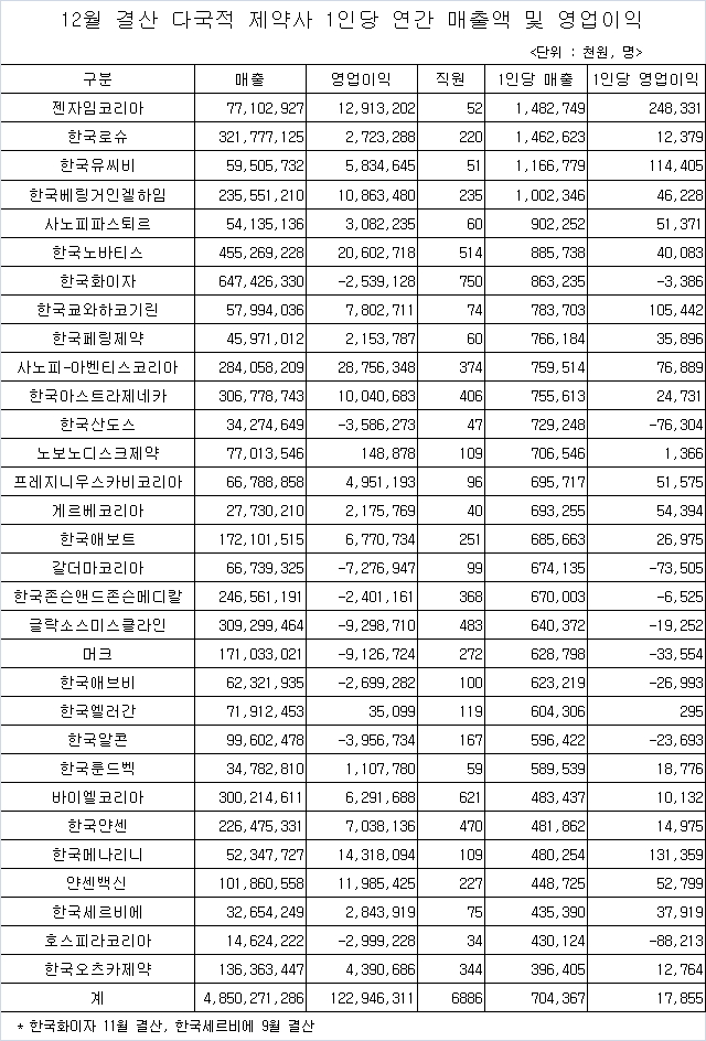 다국적 제약사 한국법인중 직원 1인당 연간 매출액이 가장 많은 업체는 젠자임코리아 14억 8,300만원이었으며. 한국로슈 14억 6,300만원, 한국유씨비 11억 6,700만원, 한국베링거인겔하임 1억 200만원 등이었다.