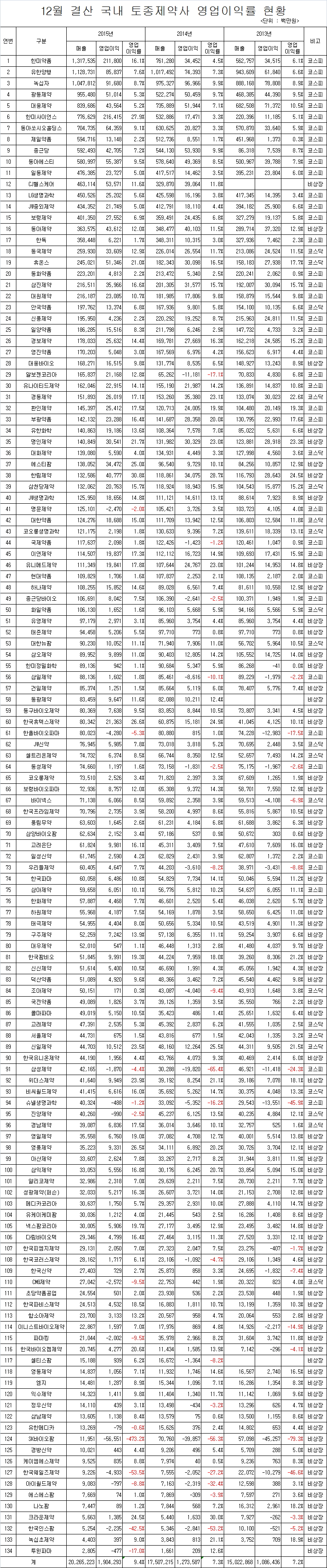 한편, 상장제약사 60곳의 영업이익률은 연도별로 살펴보면 2012년 6.0%, 2013년 7.0%, 2014년 6.7%, 2015년 9.1%였다.