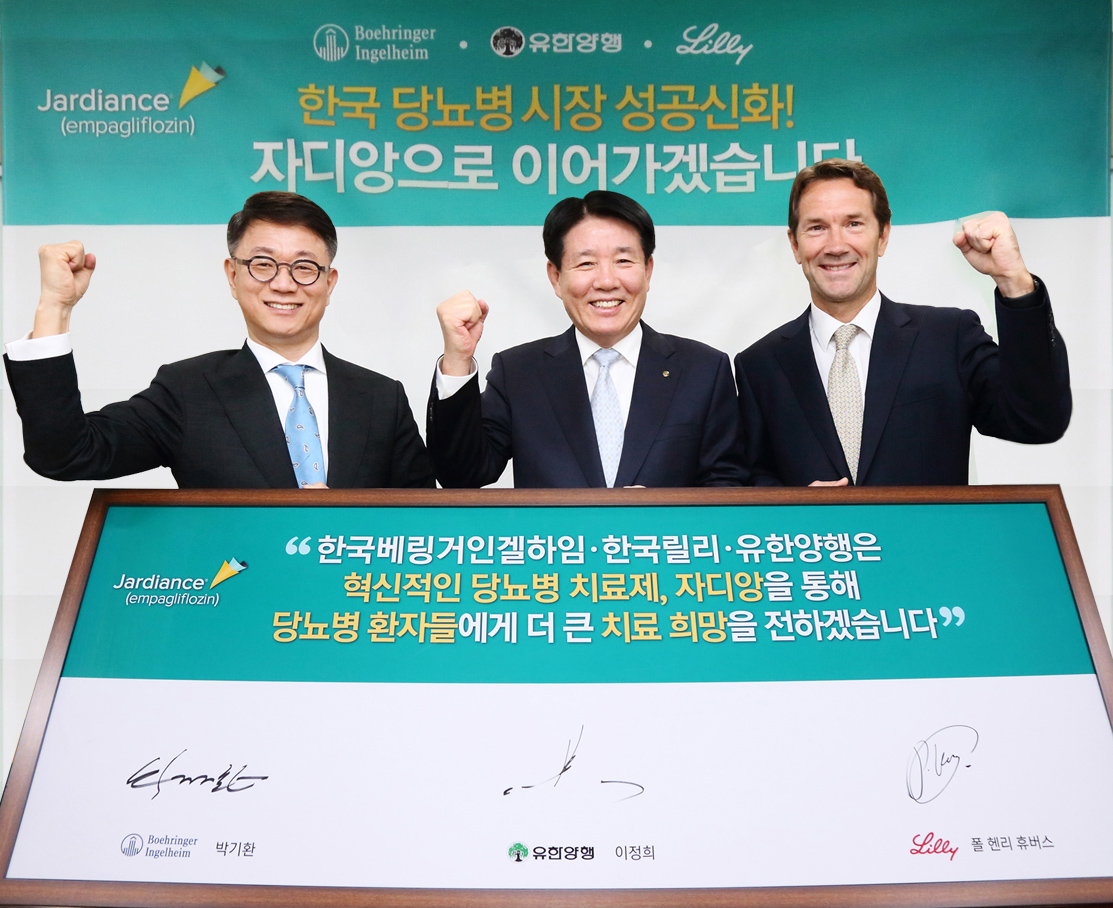한국베링거인겔하임과 한국릴리, 유한양행은 25일 제2형 당뇨병 신약인 자디앙 출시를 앞두고 마케팅 및 영업 활동의 협력을 다짐하는 기념식을 가졌다.