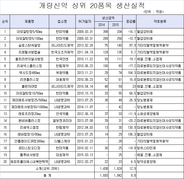 식품의약품안전처가 집계한 2015년 의약품 생산실적에 따르면 지난해 개량신약 총 생산실적은 1,842억이고, 이중 상위 20개 품목의 생산액은 1,624억이었다.