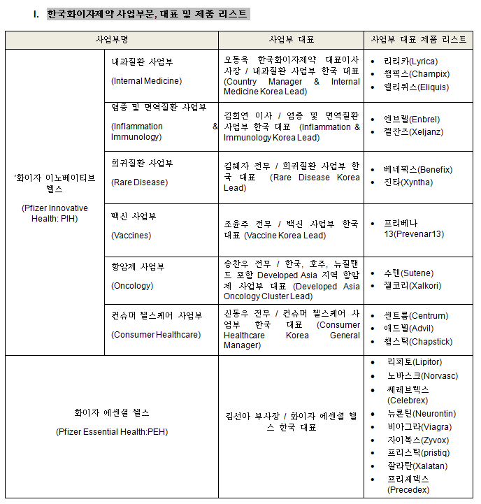 ‘화이자 이노베이티브 헬스’ 사업부문은 내과질환(Internal Medicine), 염증 & 면역질환 (Inflammation & Immunology), 희귀질환(Rare Disease), 백신(Vaccines), 항암제(Oncology), 컨슈머 헬스케어(Consumer Healthcare) 등 6개 사업부로 구성된다.