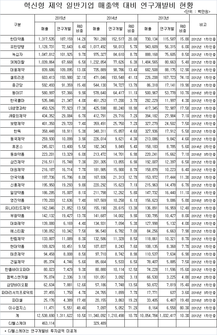 혁신형 제약기업으로 인증을 받은 기업들이 모두 연구개발비 투자 비중이 높지는 읺았다.