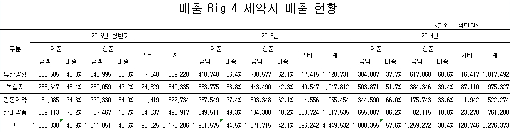 제약업체들의 잇따른 매출 1조원 달성이라는 화려한 성적의 이면에는 상품 매출의 증가라는 다소 어두운 그림자가 드리우고 있는 상황이다.