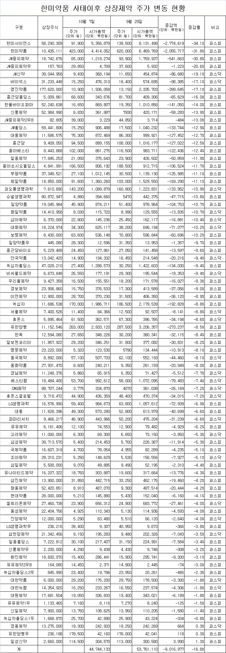 지난 9월 29일 대비 10월 7일 종가기준으로 상장제약사들의 주가는 무려 16.8% 하락하고, 상장제약사들의 시가총액은 9조 170억원 감소한 것으로 드러났다.