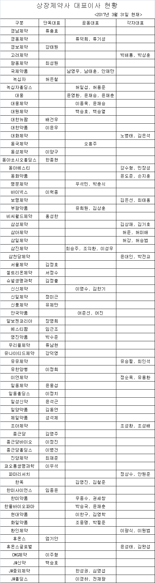 상장제약사중 각자 대표이사 체제를 운영하고 있는 제약사는 고려제약, 대화제약, 동화약품, 보령제약, 삼성제약, 삼아제약, 삼일제약, 심진제약, 삼천당제약. 유유제약, 이연제약, 조아제약, 파마리서치프로덕트, 환인제약 등으로 파악됐다.