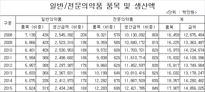 특히 2013년이후부터 전문의약품 생산품목은 급증 추세를 보이고 있다. 2012년 9,860개였으나 2015년에는 1만 2,283개로 3년동안 2,400개이상 늘어났다.
