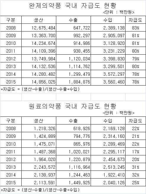 2008년 원료의약품 자급도는 22%였으나 2013년 30%, 2014년 32%까지 높아졌다.