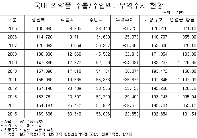 지난 2010년부터 2015년까지 의약품 수출액은 총 14조 2,901억원에 의약품 수입액은 33조 1,729억원으로 지난 6년간 무역수지 적자는 무려 18조 8,828억원에 달했다.