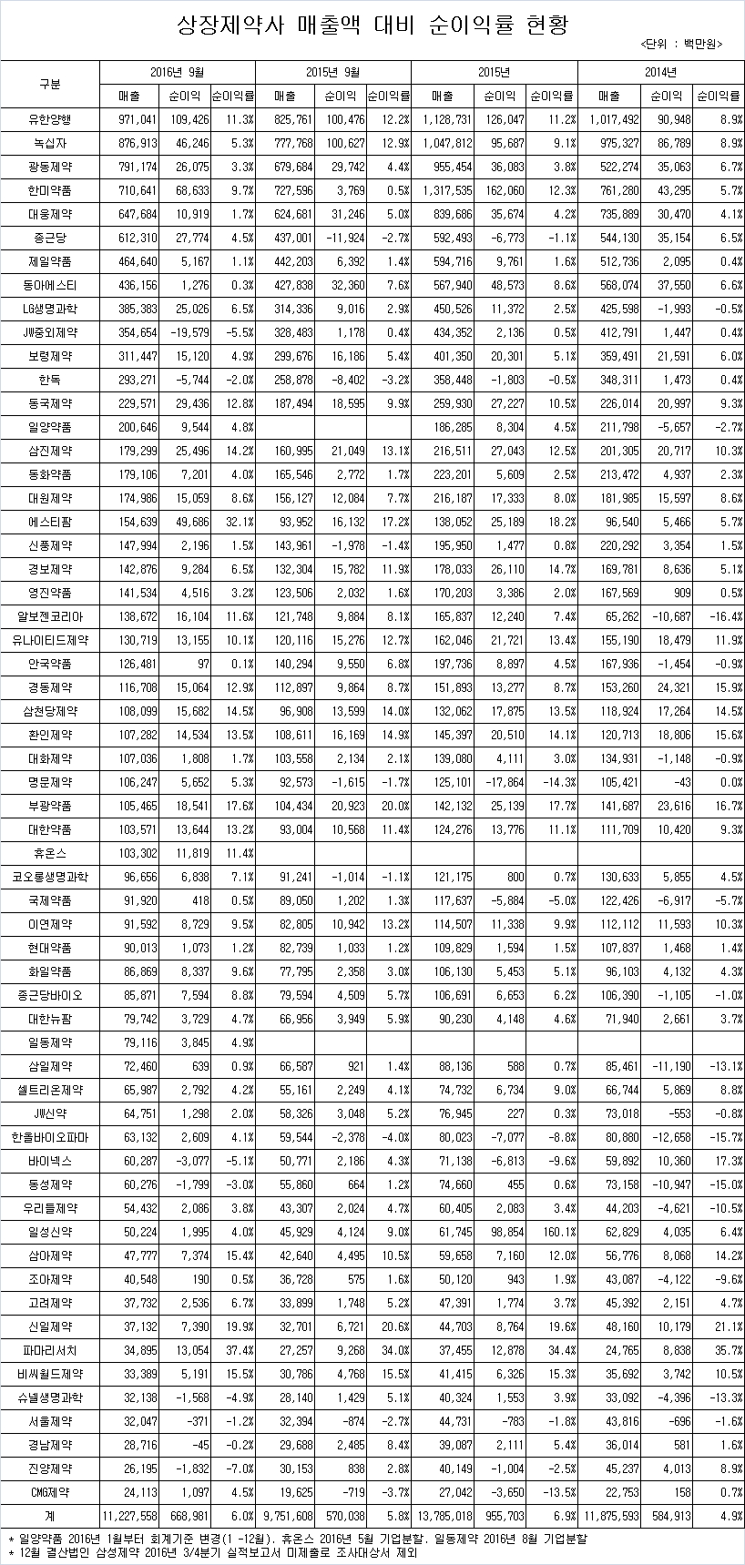 약업닷컴(www.yakup.com)이 12월 결산 코스피 및 코스닥 상장제약사들의 2016년 3분기 보고서를 분석한 결과, 9월말 현재 제약업체들의 매출액 순이익률은 평균 6.0%로 집계됐다.