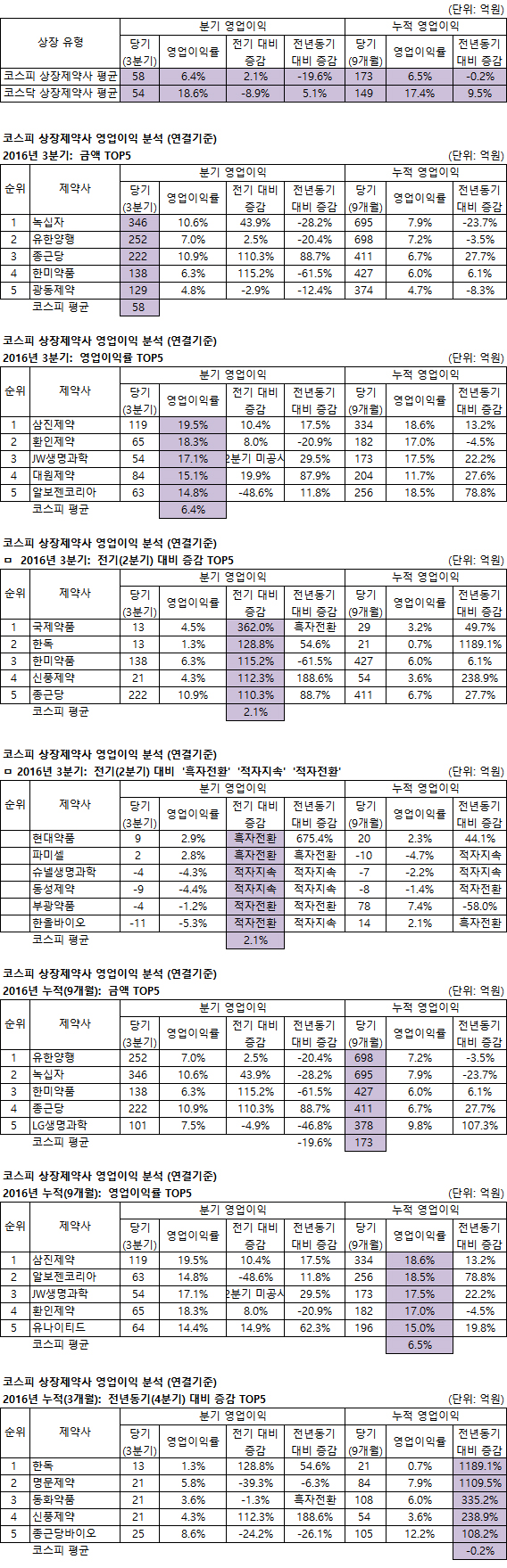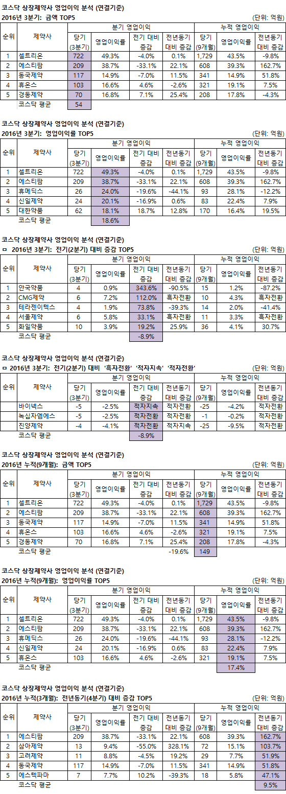 제약사별로 3분기(전기대비) 안국약품은 3억(매출총이익 12억 감소, 판관비 15억 감소), CMG제약은 3억(제품매출원가 5억 감소), 테라젠이텍스는 2억(판관비 급여 2억 감소), 서울제약은 1.4억(매출총이익 6.3억 감소, 판관비 7.7억 감소), 화일약품은 2억(대손상각비 5억 감소) 각각 증가했다. 바이넥스는 2분기 연속 적자를 기록했고, 진양제약과 녹십자엠에스는 '적자전환'했다.