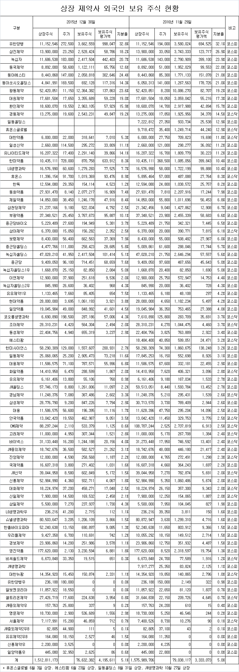 약업닷컴(www.yakup.com)이 코스피 및 코스닥 상장제약사들의 외국인 주식 지분 보유 현황을 조사한 결과, 11월 29일 현재 평균 5.0%인 것으로 파악됐다.