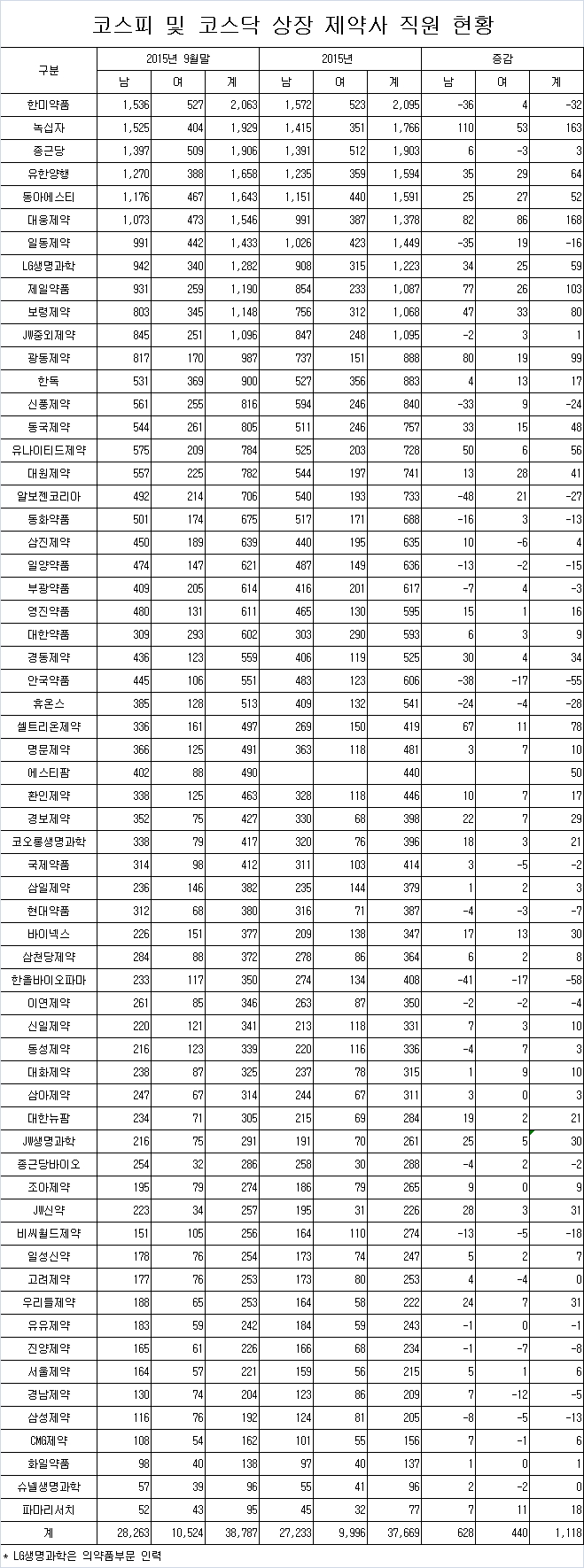 한편, 상장제약사중 직원 수가 1천명 이상인 업체는 한미약품 2.063명, 녹십자 1,929명, 종근당 1,906명, 유한양행 1,658명, 동아에스티 1,643명, 대웅제약 1,546명, 일동제약 1,433명, LG생명과학 1,282명. 제일약품 1,190명, 보령제약 1,148명, LW중외제약 1,096명 등 11개사로 파악됐다.