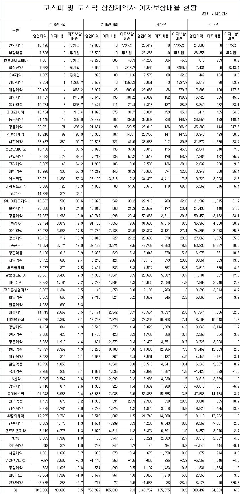 약업닷컴(www,yakup.com)이 코스피 및 코스닥 상장제약사들의 2016년 9월말 현재 이자보상배율을 분석한 결과 평균 8.5%로 나타났다.