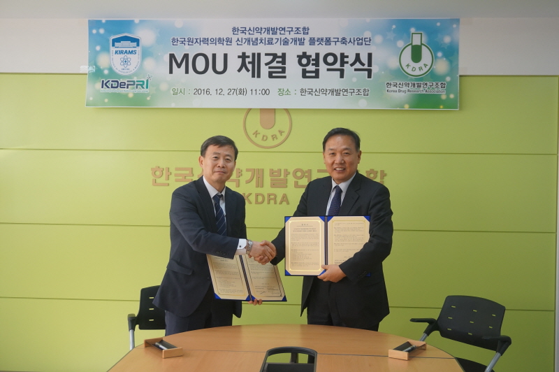 한국신약개발연구조합(이사장 김동연)과 한국원자력의학원 신개념치료기술개발플랫폼구축사업단(사업단장 류국현)'은 12월 27일 11시 한국신약개발연구조합 대회의실에서 우리나라의 신약개발산업 활성화와 양 기관의 발전을 위한 신약개발 업무협약을 체결했다.