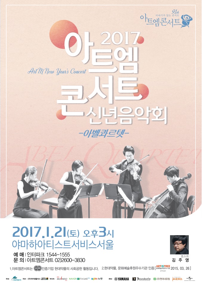 이번 91회 아트엠콘서트의 주인공은 차세대 유망주로 구성된 현악사중주단‘아벨콰르텟’이다. 바이올린 윤은솔, 게스트 박수현, 비올라 김세준, 첼로 조형준으로 구성된 ‘아벨콰르텟’은 2015년 하이든 국제 실내악 콩쿠르에서 우승, 2015년 제 11회 리옹 국제 실내악 콩쿠르 2위를 기록하는 등 5개월이라는 짧은 기간동안 저명한 국제 콩쿠르에서 3번이나 입상하며 뛰어난 연주 실력을 인정받았다. 또 가장 최근에는 지난해 11월 제 71회 제네바 국제 콩쿠르 현악사중주부문에서 한국인 최초로 3위로 입상하는 쾌거를 이루기도 했다.
