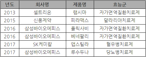 EMA(유럽의약품청) 승인 품목은 2013년 램시마(자가면역질환치료제·셀트리온)가 물꼬를 튼 이후 2015년 피라맥스(말라리아치료제·신풍제약)에 이어 2016년 플릭사비(자가면역질환치료제·삼성바이오에피스)와 베네팔리(자가면역질환치료제·삼성바이오에피스), 2017년 앱스틸라(혈우병치료제·SK케미칼)와 루수두나(항당뇨제·삼성바이오에피스)가 시판허가를 받아내는 성과를 거뒀다.