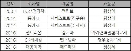 먼저 미 FDA(식품의약국)승인을 받은 품목은 모두 6품목으로, 2013년 팩티브(항생제·LG생명과학)를 시작으로 2014년 시벡스트로(항생제·동아ST) 경구용, 주사제에 이어 2016년 램시마(자가면역질환치료제·셀트리온), 앱스틸라(혈우병치료제·SK케미칼), 메로페넴(항생제·대웅제약) 등 3개 품목이 연달아 시판허가를 취득했다.