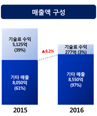 작년 매출액 및 영업이익은 직전해(2015년) 5,125억원의 기술료 수익으로 인한 기고효과 및 기술계약 수정이 반영돼 감소했으며, 기술료 수익을 제외한 기타매출은 전년대비 6.2% 성장한 수치라고 회사측은 설명했다.