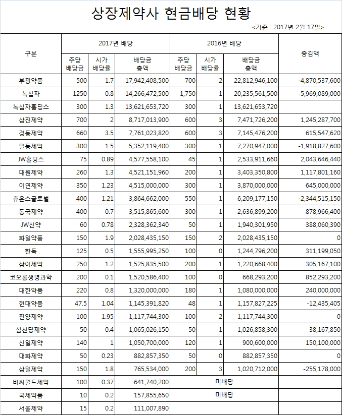 2015년에는 대구모 신약기술수출에 따라 200억원이 넘는 현금배당을 실시했던 한미약품은 2월 17일 현재 현금배당 여부를 결정하지 못하고 있다. 지난 2016년 각종 악재로 인해 매출 및 수익성에 악영향을 받았기 때문에 현금배당을 실시하지 읺을 가능성도 있다는 지적이다.