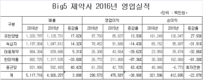 제약업계에서 이른바 Big5라고 지칭하는 매출 상위권 제약사중 지난해 영업실적이 가장 우수한 제약사는 유한양행과 종근당으로 분석됐다.