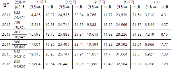 제약업계의 종사자수는 2016년 9만 4,929명으로, 2011년(7만 4,477명) 대비 27.5% 증가했다. 이는 5년 만에 2만 여명이 늘어난 것으로, 단순 셈법으로 5년간 매해 4,000명 이상의 신규 인력을 고용한 셈이다.