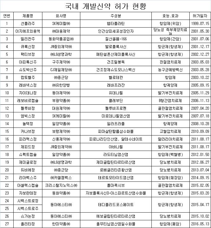 식품의약품안전처는 올해 전망을 통해 국산 신약이 1개 허가를 받을 것으로 예측했다. 그동안 국산 신약으로 허가받은 품목은 총 27개이다.