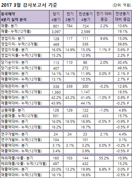 부문별로 4분기 매출은 전기대비 17억 증가(내수 40억 감소, 해외매출 57억 증가),전년대비 77억 증가(내수 61억 증가, 해외매출 16억 증가)했고, 누적매출은 전년대비 498억 증가(+19.1%)=내수 432억 증가, 해외매출 66억 증가)했다.