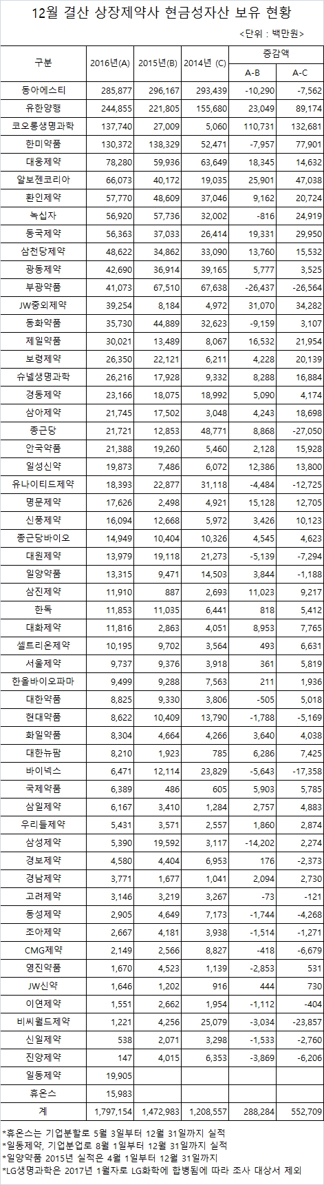 지난해 기업 분할한 휴온스와 일동제약을 제외한 55개사의 현금성 자산은 2015년과 비교할 때 2,883억 늘었다. 2014년과 비교하면 5,527억원이 증가한 것이다.