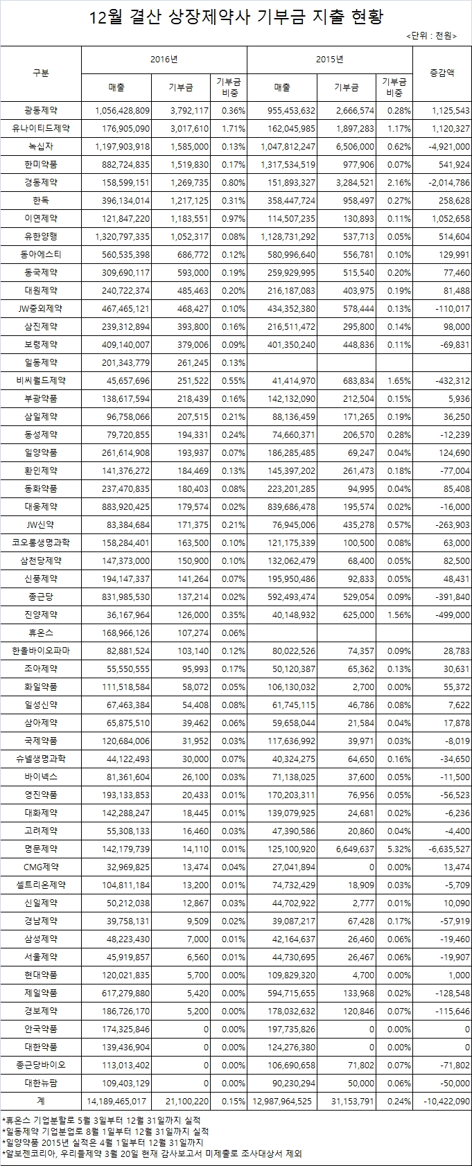 상장제약사중 기부금 지출액이 가장 많은 업체는 광동제약은 37억 9,210만원이었고, 뒤를 이어 유나이티드제약 30억 1,760만원, 녹십자 15억 8,500만원, 한미약품 15억 1,980만원, 경동제약 12억 6,970만원, 한독 12억 1,710만원, 이연제약 11억 8,350만원, 유한양행 10억 5,230만원 등 연간 기부금 지출액이 10억원을 넘는 제약사는 8개사로 조사됐다.