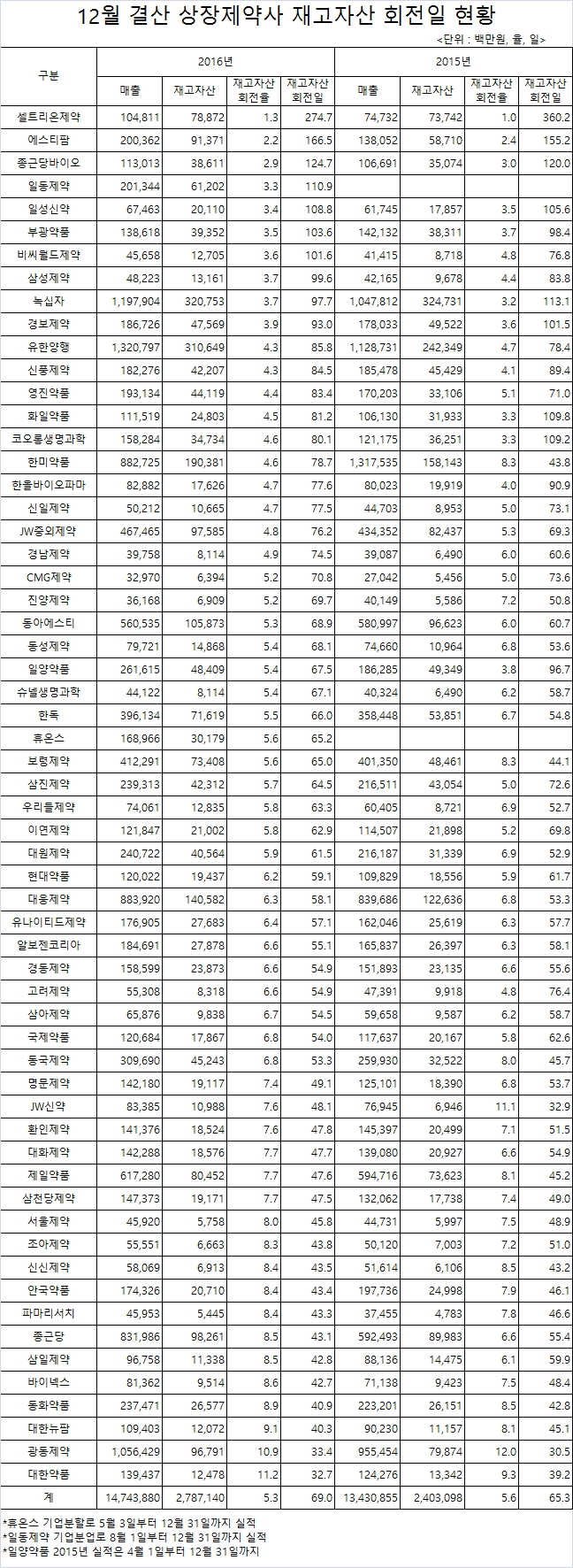 약업닷컴(www.yakup.com)이 12월 결산 코스피 및 코스닥 상장제약사들의 2016년 감사보고서를 분석한 결과, 평균 재고자산회전일은 69일로 나타났다.