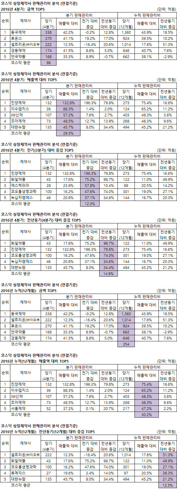 4분기 전기(3분기) 대비 판관비 증감률이 가장 높은 제약사는 코스피는 파미셀, 코스닥은 진양제약, 4분기 전년동기대비 판관비 증감률이 가장 높은 제약사는 코스피는 동성제약, 코스닥은 화일약품, 지난해 전년동기대비 판관비 증감률이 가장 높은 제약사는 코스피는 일양약품, 코스닥은 셀트리온(바이오 부분), 지난해 매출액 대비 판관비가 가장 높은 제약사는 코스피는 동성제약, 코스닥은 진양제약으로 각각 나타났다.