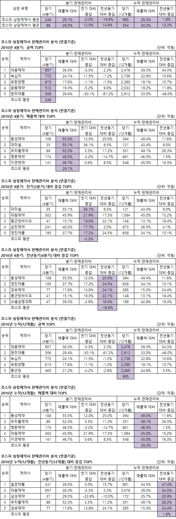매출액대비 판관비는 1위부터 5위까지 모두 45%를 넜었고(평균 29.3%) 전년동기대비 증감률은 일양약품이 47.4%로 수위를 차지한 가운데, 대웅제약 삼성제약이 30%를 넘으며 2,3위를 우리들제약 경보제약이 20%를 넘으며 4,5위를 차지했다(평균 1.8%)