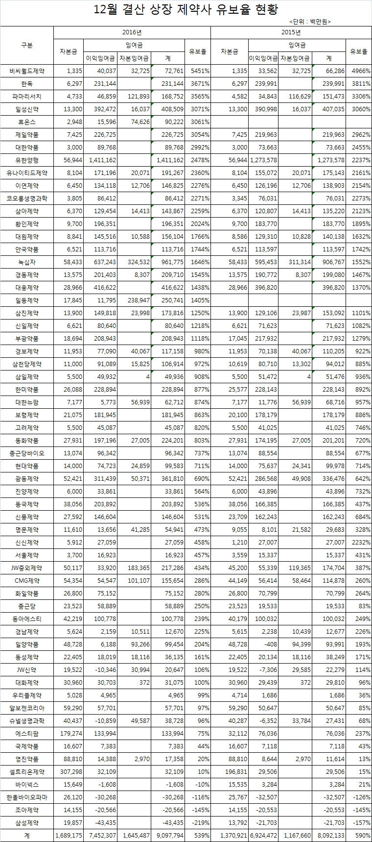 특히 이익잉여금이 적자상태인 삼성제약, 조아제약, 한올바이오파마, 바이넥스 등 4개사는 유보율이 마이너스를 기록했다.