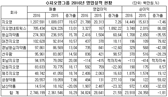 금융감독원에 보고된 지오영그룹(계열사·관계사 포함 11개사)과 백제약품그룹(백제에치칼약품 포함)의 2016년 실적을 분석한 결과 매출은 각각 2조7,461억원, 1조918억원을 기록하며, 전년 대비 두 자릿수의 성장세를 보였다. 반면 순이익에서는 모두 감소세를 보이며 의약품유통시장의 팍팍해진 경기상황을 방증했다.