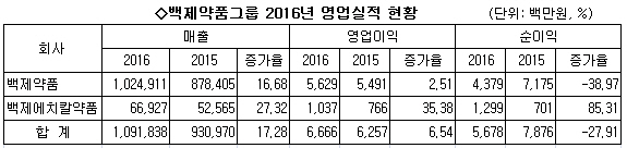 백제약품그룹은 백제약품과 백제에치칼약품 2곳(초당약품 제외)이 지난해 1조918억원을 기록, 전년 보다 17.28% 성장했다. 영업이익도 66억원으로 6.54% 늘었다. 하지만 순이익은 전년 대비 27.91% 줄어든 56억원을 기록하는데 그쳤다.