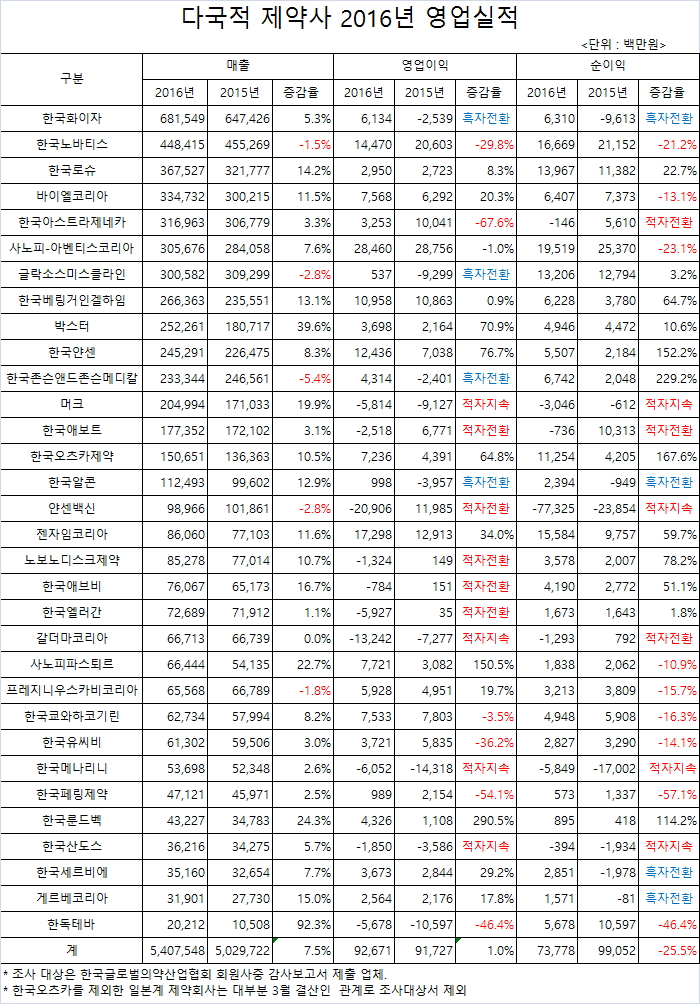 다국적 제약사들은 2015년 대비 영업이익이 다소 늘었다. 국내제약사들은 영업이익이 평균 20% 이상 감소했지만 다국적 제약사들은 1% 증가해 지난해 선전했다는 평가이다.