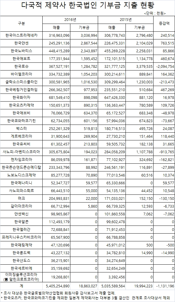 지난해 기부금 지출이 가장 많았던 다국적 제약사는 한국아스트라제네카로 30억 3,700만원이었고, 뒤를 이어 한국얀센 28억 6,800만원, 한국노바티스 23억 4,400만원, 한국에보트 15억 9,500만원, 한국로슈 12억 8,500만원, 바이엘코리아 10억 5,400만원, 글락소스미스클라인 10억 1,700만원 등의 순이었다.