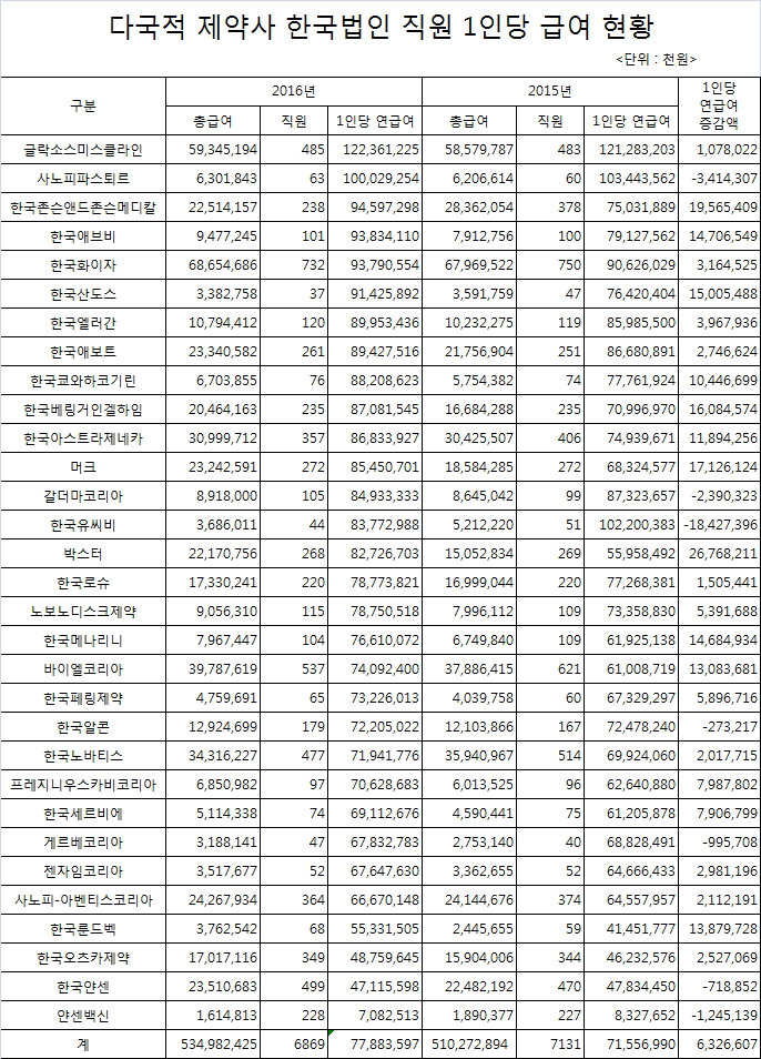 다국적 제약사 한국법인중 직원 1인당 급여가 가장 많은 곳은 글락소스미스클라인으로 1억 2,236만원이었다. 뒤를 이어 사노피파스퇴르가 1억원으로 뒤를 이었다.
