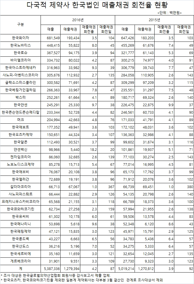 약업신문(www.yakup.com)이 한국글로벌의약산업협회 회원사와 일본계 다국적 제약사 등 총 31개사의 2016년 매출채권 회전기일 현황을 집계한 결과 평균 87일 집계됐다. 이는 2015년 대비 5일가량 단축된 것이다.