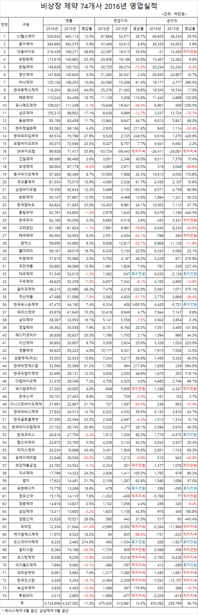비상장 제약 74개사중 2015년 대비 매출, 영업이익, 순이익이 20% 이상 증가한 업체는 한국프라임제약, 한국팜비오, 알리코제약, 한국씨엔에스팜, 한국바이오켐제약, 마더스제약, 익수제약, 엠지, 경방신약, 오스코리아제약 등 10개사로 조사됐다.