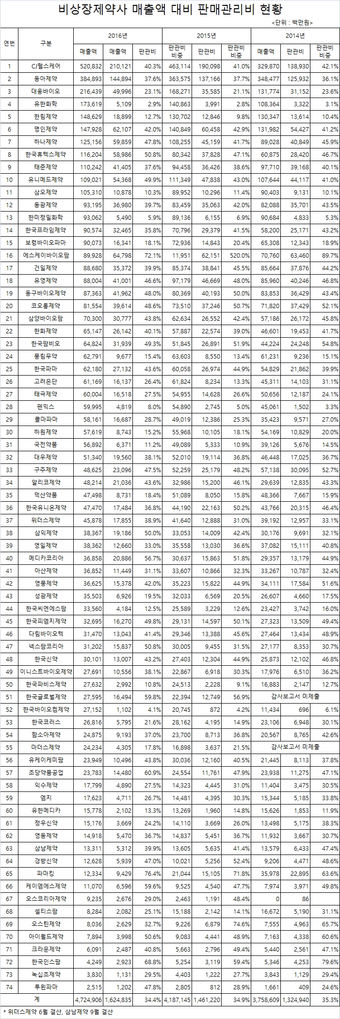 약업닷컴(www.yakup.com)이 비상장 제약 74개사의 2016년 감사보고서를 분석한 결과, 매출액 대비 판매관리비 비중은 평균 34.4%로 집계됐다.
