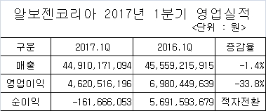 알보젠코리아는 2017년 1분기에 449억 1,000만원의 매출을 기록해 전년동기 대비 1.4% 감소했다고 15일 밝혔다.