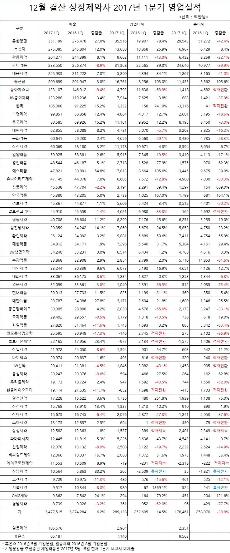 약업닷컴(www.yakup.com)이 12월 결산 상장 제약 58개사의 2017년 1분기 보고서를 분석한 결과, 매출은 전년 동기대비 평균 6.2% 증가하고 영업이익은 14.5% 증가한 것으로 집계됐다. (지주회사, 바이오제약사 제외)