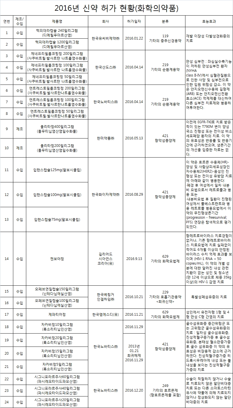 항악성 종양제로 허가받은 신약은 한미약품의 비소성폐암치료제 '올리타정 400mg(올무티닙염산염일수화물)' 등 2품목, 한국화이자제약의 유방암치료제 '입랜스캡슐125mg(팔보시클립)' 등 3품목, 한국노바티스의 골수섬유화증치료제 '자카비정10밀리그램(룩소리티닙인산염)' 등 4품목이다.