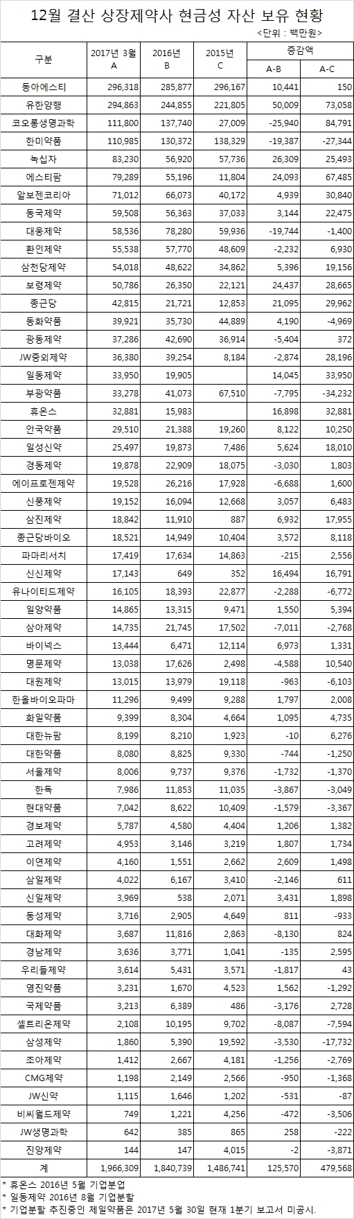 약업덧컴(www.yakup.com)이 12월 결산 코스피 및 코스닥 상장 제약사들의 2017년 1분기 보고서를 분석한 결과, 이들 제약사들이 보유하고 있는 현금성 자산은 1조 9,663억으로 집계됐다. <지주회사 및 바이오제약사 제외>