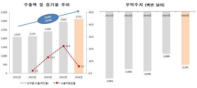 한편, 2016년 보건산업(의약품·의료기기·화장품) 수출액은 총 102억 달러(11.9조원)로 최초 100억 달러를 돌파했으며 최근 5년 간 연평균 19.4% 증가했다.
