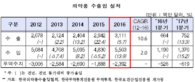 2017년 1분기 의약품 수출액은 7.5억 달러(8,459억원)로 2016년 1분기 대비 13.3% 증가하며 올해도 꾸준한 성장세를 보였다.